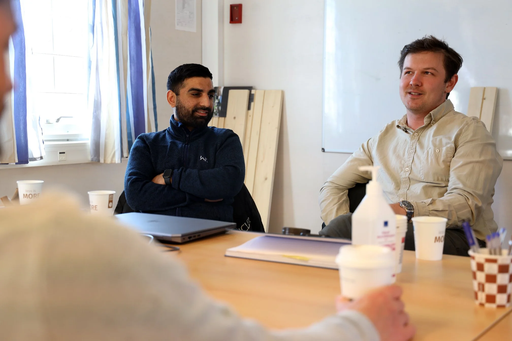 De sitter samlet rundt et bord på brakkeriggen som normalt er hovedkvarter for oppføringen av sentrumsskolene i Sande. Det er dagens siste pause før de skal i en runde til med coaching. I grupper på tre eller fire er det en som coaches av en annen, mens en tredje er observatør.